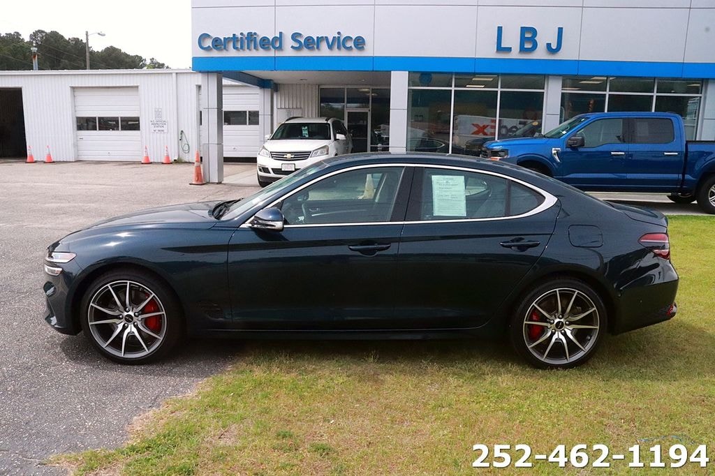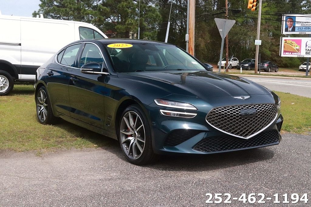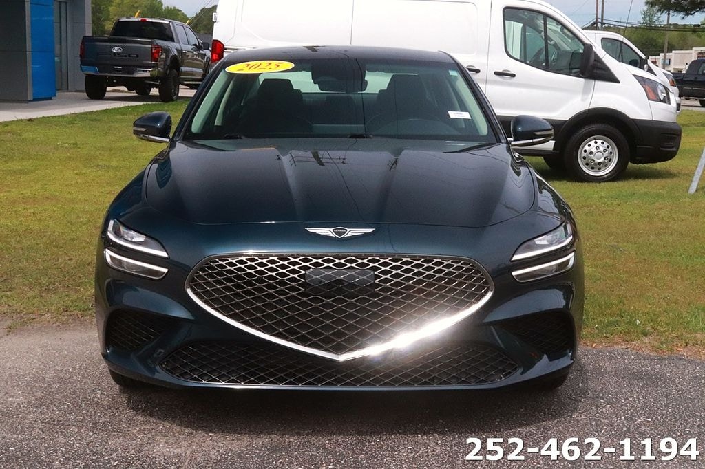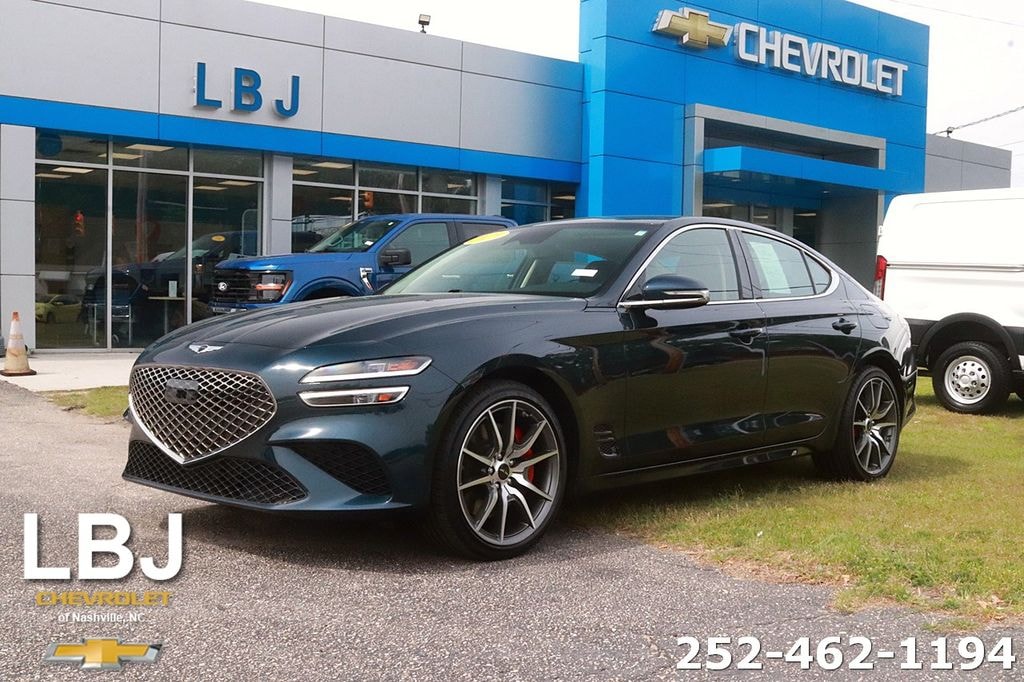Equipped with Option Group 01, 4-Wheel Disc Brakes, 6 Speakers, ABS brakes, Air Conditioning, Alloy wheels, AM/FM radio: SiriusXM, Android Auto & Apple CarPlay, Anti-whiplash front head restraints, Auto High-beam Headlights, Auto-dimming Rear-View mirror, Automatic temperature control, Brake assist, Bumpers: body-color, Delay-off headlights, Driver door bin, Driver vanity mirror, Dual front impact airbags, Dual front side impact airbags, Electronic Stability Control, Emergency communication system: Genesis Connected Services, Exterior Parking Camera Rear, Four wheel independent suspension, Front anti-roll bar, Front Bucket Seats, Front Center Armrest, Front dual zone A/C, Front reading lights, Fully automatic headlights, Garage door transmitter: HomeLink, Heated door mirrors, Heated front seats, Heated Multi-Adjustable Front Bucket Seats, Illuminated entry, Knee airbag, Leather steering wheel, Leatherette Seating Surfaces, Low tire pressure warning, Navigation System, Occupant sensing airbag, Outside temperature display, Overhead airbag, Overhead console, Panic alarm, Passenger door bin, Passenger vanity mirror, Power door mirrors, Power driver seat, Power passenger seat, Power steering, Power windows, Radio: AM/FM/SiriusXM/HD Audio System, Rear anti-roll bar, Rear reading lights, Rear seat center armrest, Rear side impact airbag, Rear window defroster, Remote keyless entry, Security system, Speed control, Speed-Sensitive Wipers, Split folding rear seat, Steering wheel mounted audio controls, Tachometer, Telescoping steering wheel, Traction control, Trip computer, Turn signal indicator mirrors, Variably intermittent wipers, and Wheels: 19" x 8.0J Fr & 19" x 8.5J Rr Alloy